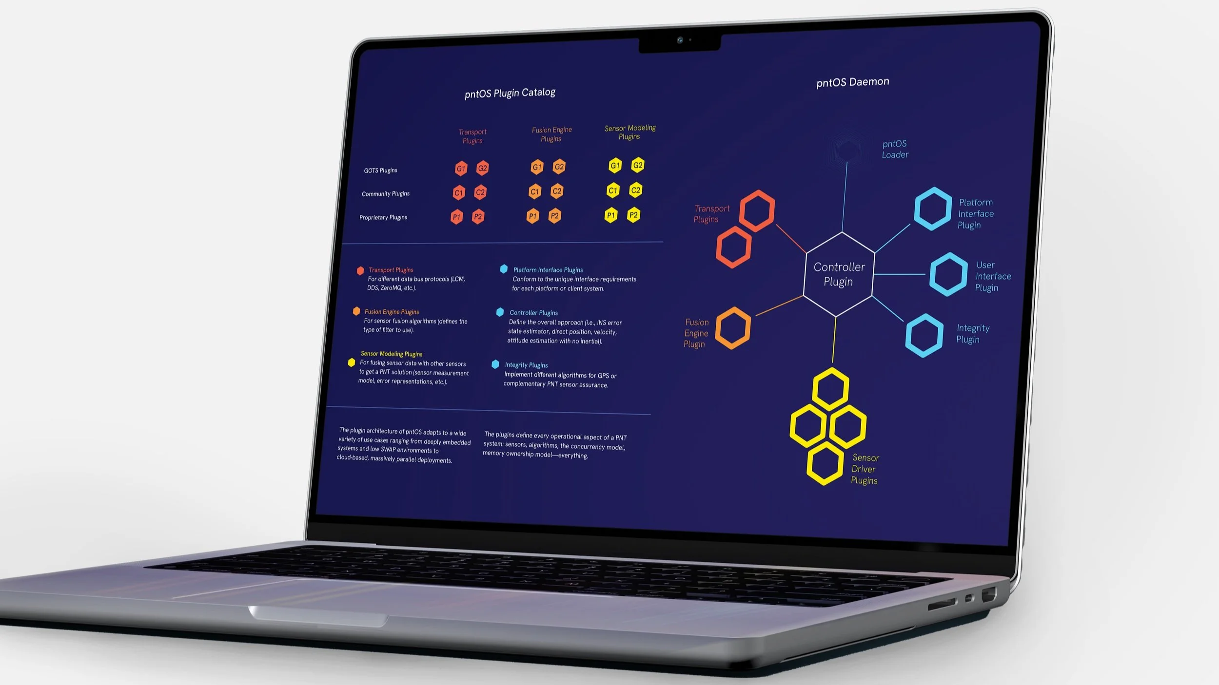 We developed pntOS, a Department of Defense (DoD) open-source architecture, which uses a plugin-based design to host customer-defined alternative navigation capabilities. pntOS features the community-developed ASPN data message standard. Standard message formats make all plugins, including government off-the-shelf (GOTS), community shared, and proprietary, individually swappable without the need for modification.